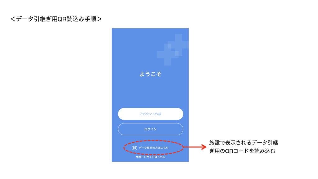 手順2.施設で表示される「データ引継ぎ用QRコード」を読取り、アカウントの再作成をしてください