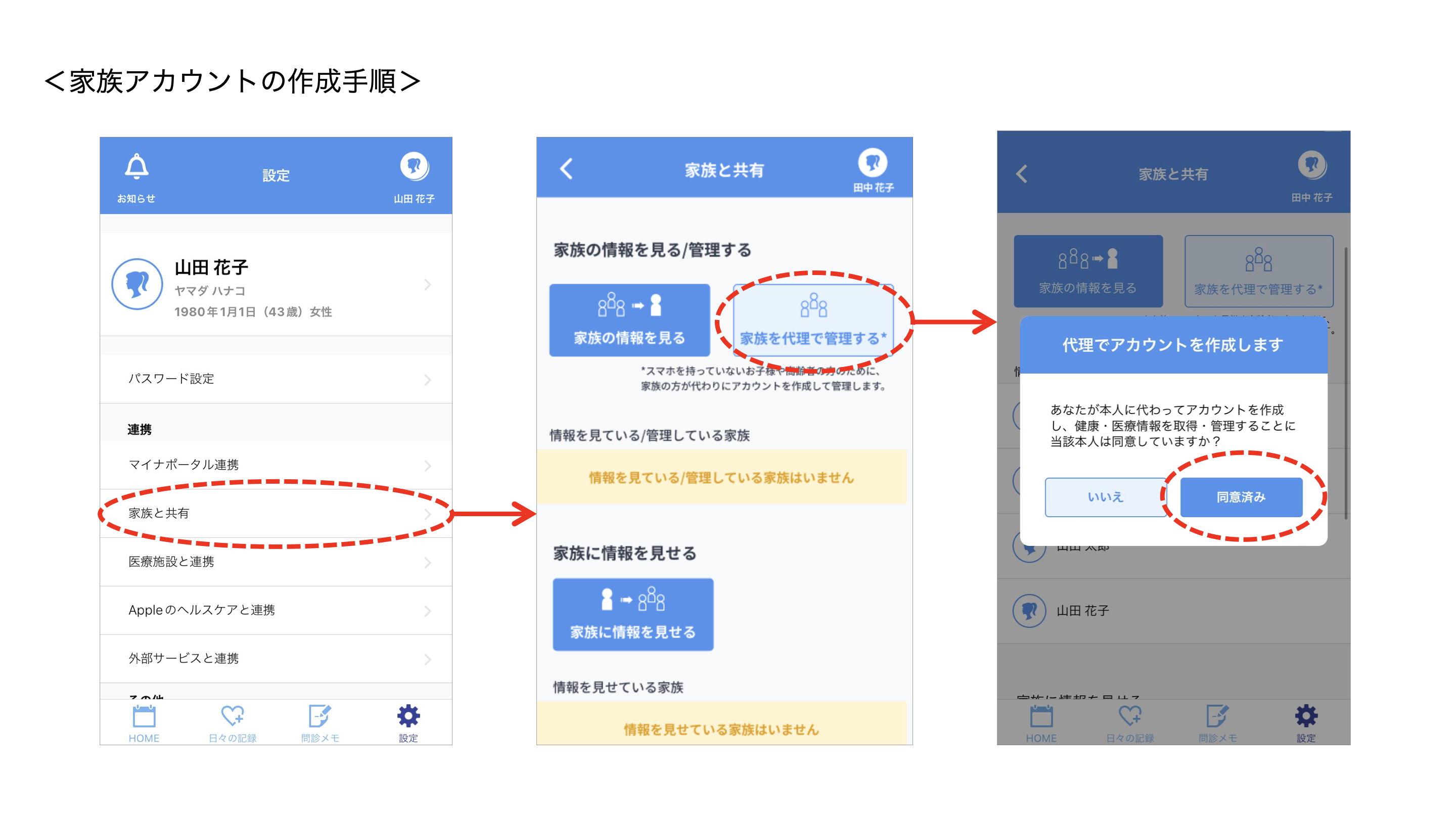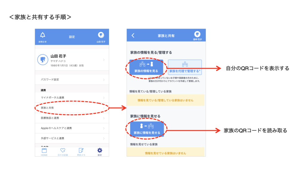 QRコードの読み込みが完了することで、ご家族と健康・医療情報を共有することができます。アプリの右上に表示されているご自身のお名前のアイコンをタップして、表示を切り替えてください。■ご家族がスマホをお持ちでない場合