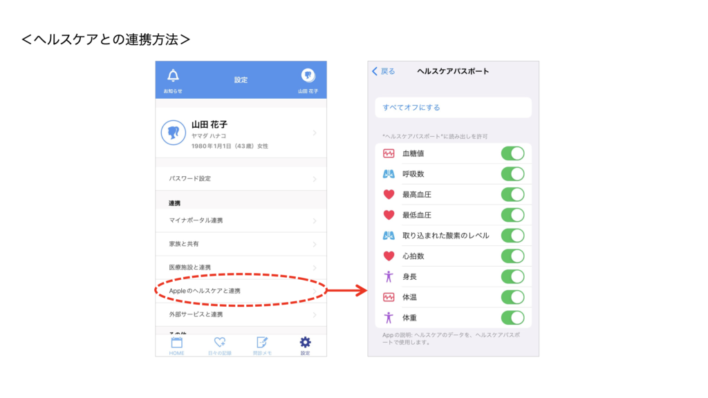 ・スマホアプリを開き、画面右下の「設定」より「Appleのヘルスケアと連携」をタップしてください。